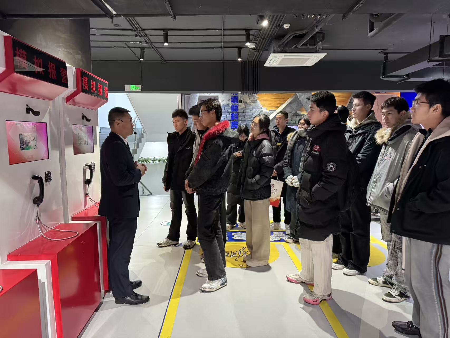在基地讲解员的引导下,学生们依次参观了消防器材展示区、模拟体验区、安全教育展厅等多个功能区域。讲解员详细介绍了消防历史知识,现场演示了粉尘爆炸火灾,电器老化、线路私拉乱接、易燃物堆放等常见火灾隐患的识别。讲解员带领同学们观看典型火灾案例视频并纠正错误;进行高层建筑绳索逃生演练;在模拟烟雾逃生通道,学生们在昏暗环境中学习低姿匍匐、捂住口鼻等正确逃生技巧,切实提升应急反应能力。学生们系统了解了校园、实验室、宿舍等场景的火灾预防要点,以及初期火灾处置、火场自救互救等关键知识。互动体验环节中,学生们积极参与消防知识问答、体验8级地震感受,在趣味实践中深化安全认知。